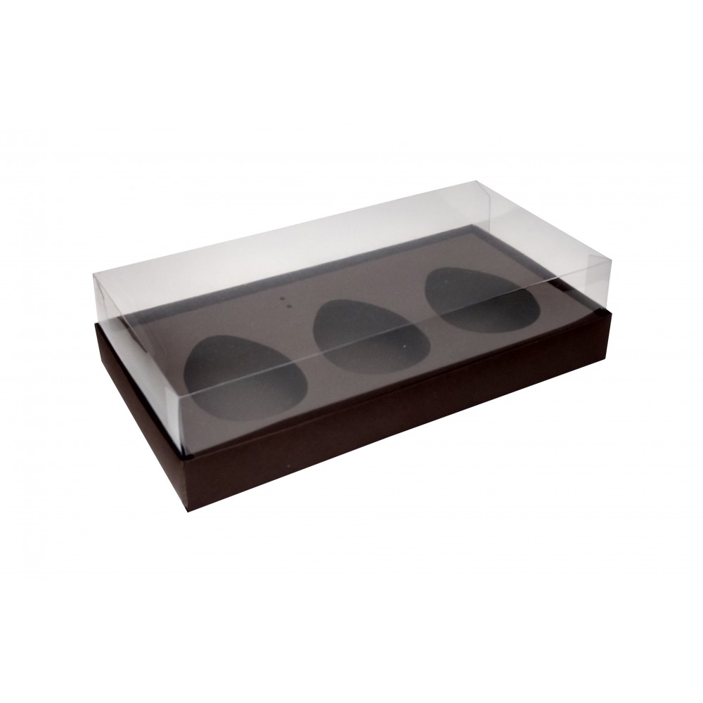 Caixa para ovos de páscoa de colher com berço interno para acomodar 3 metades de ovo de páscoa de 150g e furos para fixação da colher.